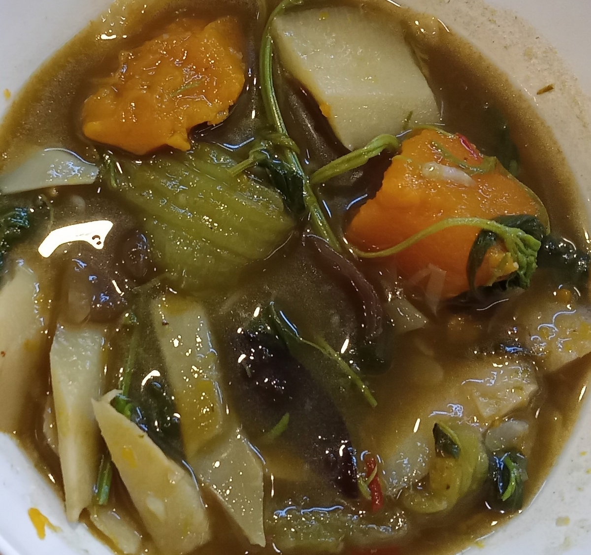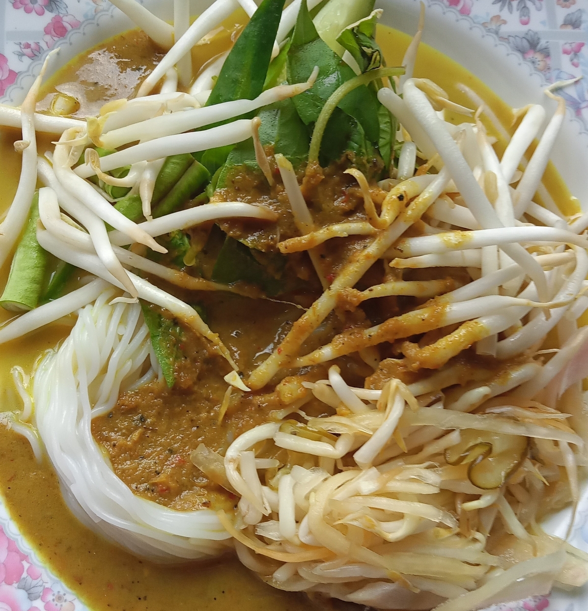 (生野菜をたっぷりかけるタイ風素麺 、スープは相当辛い)